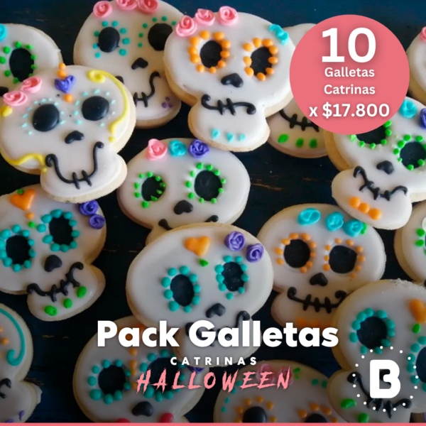 Espeluznante, colorida y aterradora Caja de 10 Galletas Catrinas de miel y vanilla, que miden 8 cms. aproximadamene, para celebrar Halloween con el sabor más dulce del terror!🎃